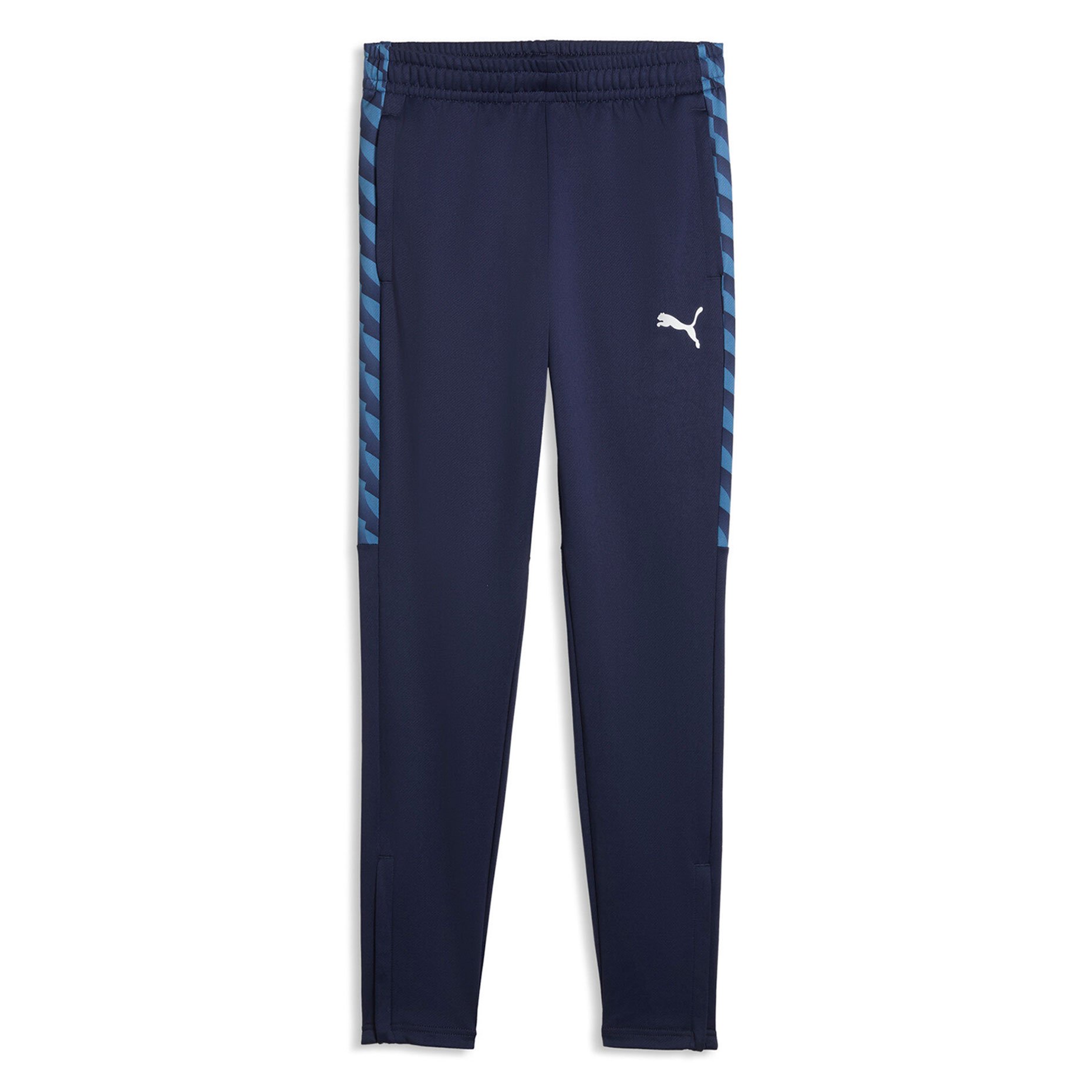 Приталенный крой обеспечивает аккуратную спортивную посадку и не ограничивает движений во время тренировок. Эластичный пояс с внутренней кулиской позволяет надежно зафиксировать брюки и легко регулировать посадку. Боковые карманы на молниях подходят для безопасного хранения необходимых мелочей, а молнии внизу штанин позволяют быстро надевать и снимать брюки, не снимая обувь. Боковые панели с графическим принтом, вдохновленным фирменным стилем PUMA Formstripe, придают модели современный спортивный вид.