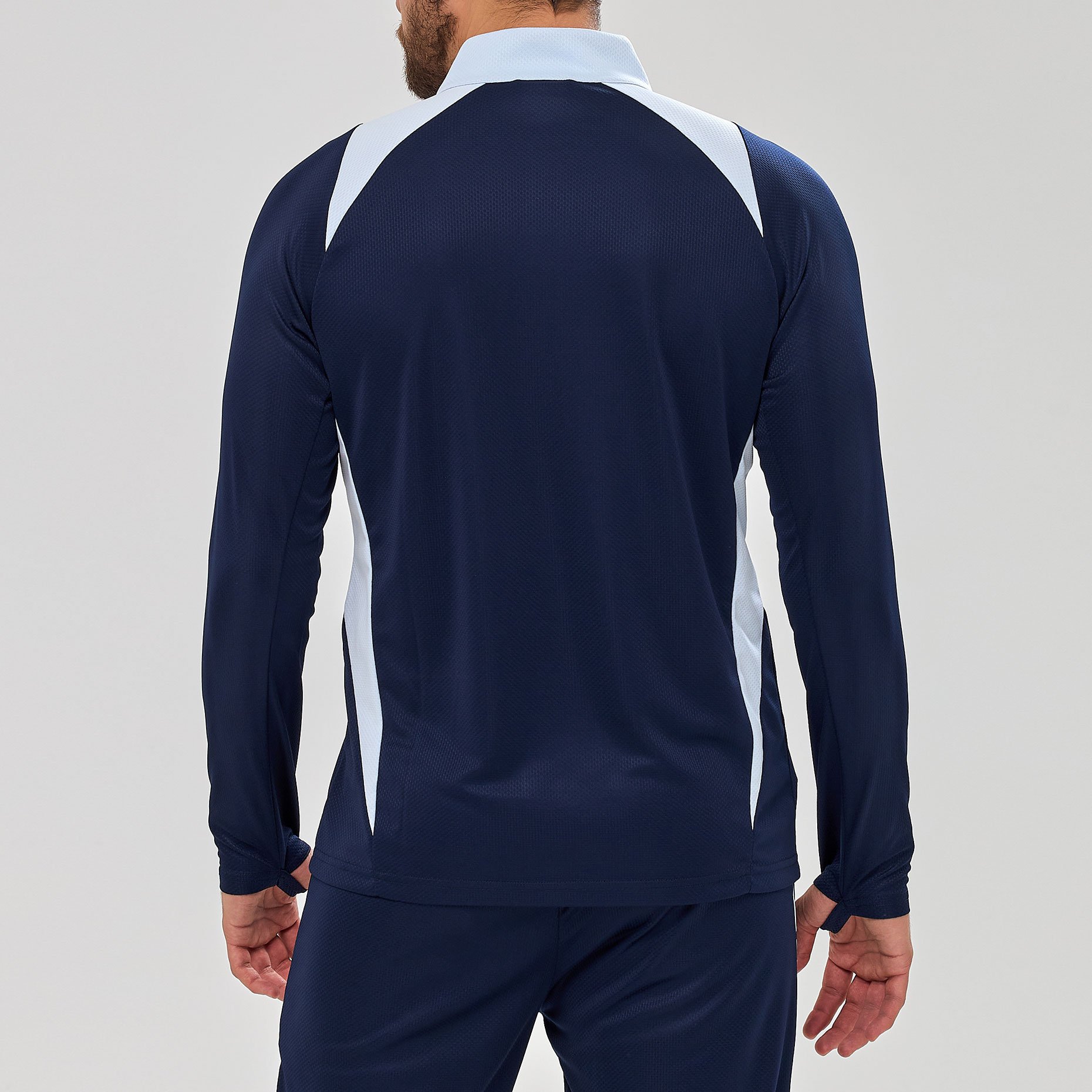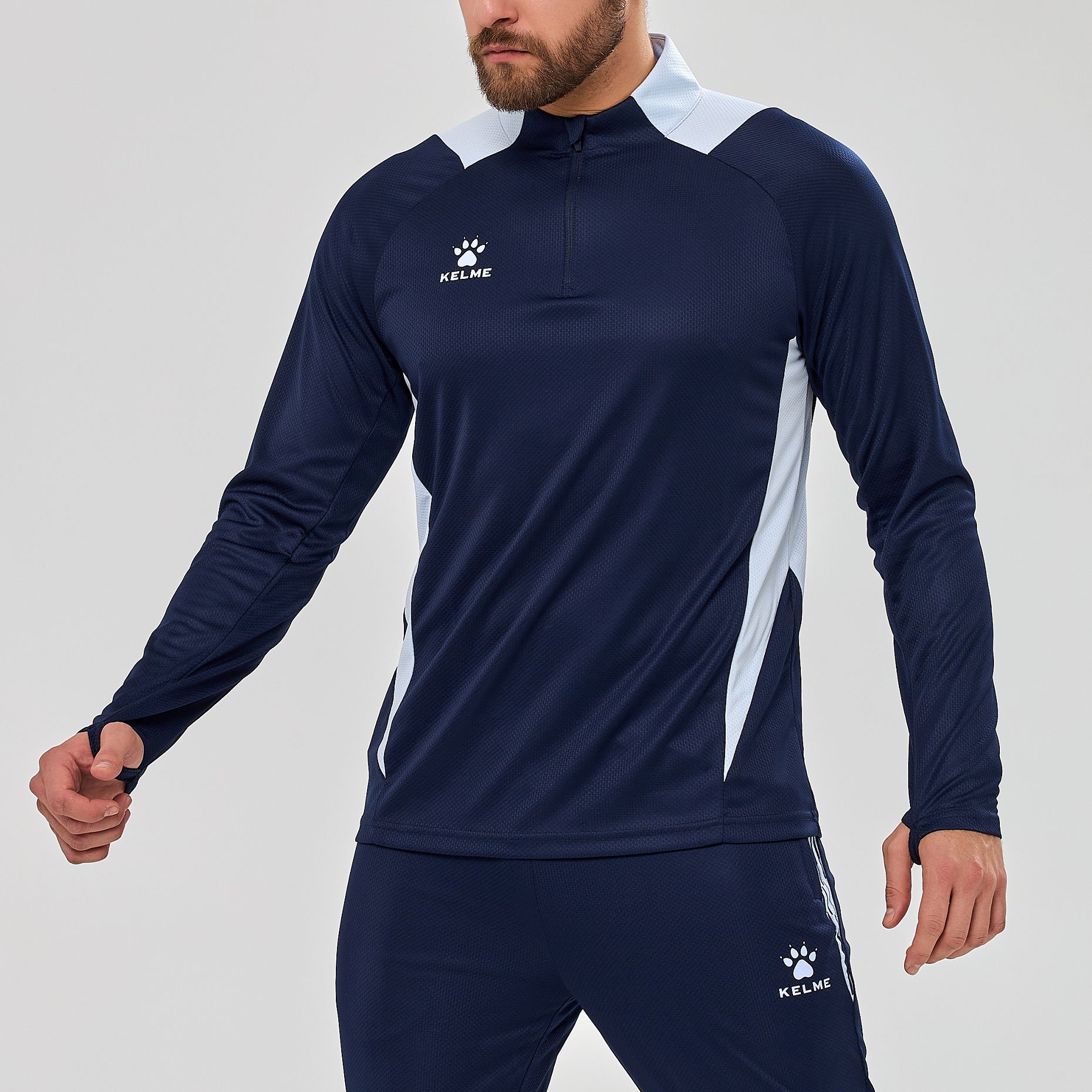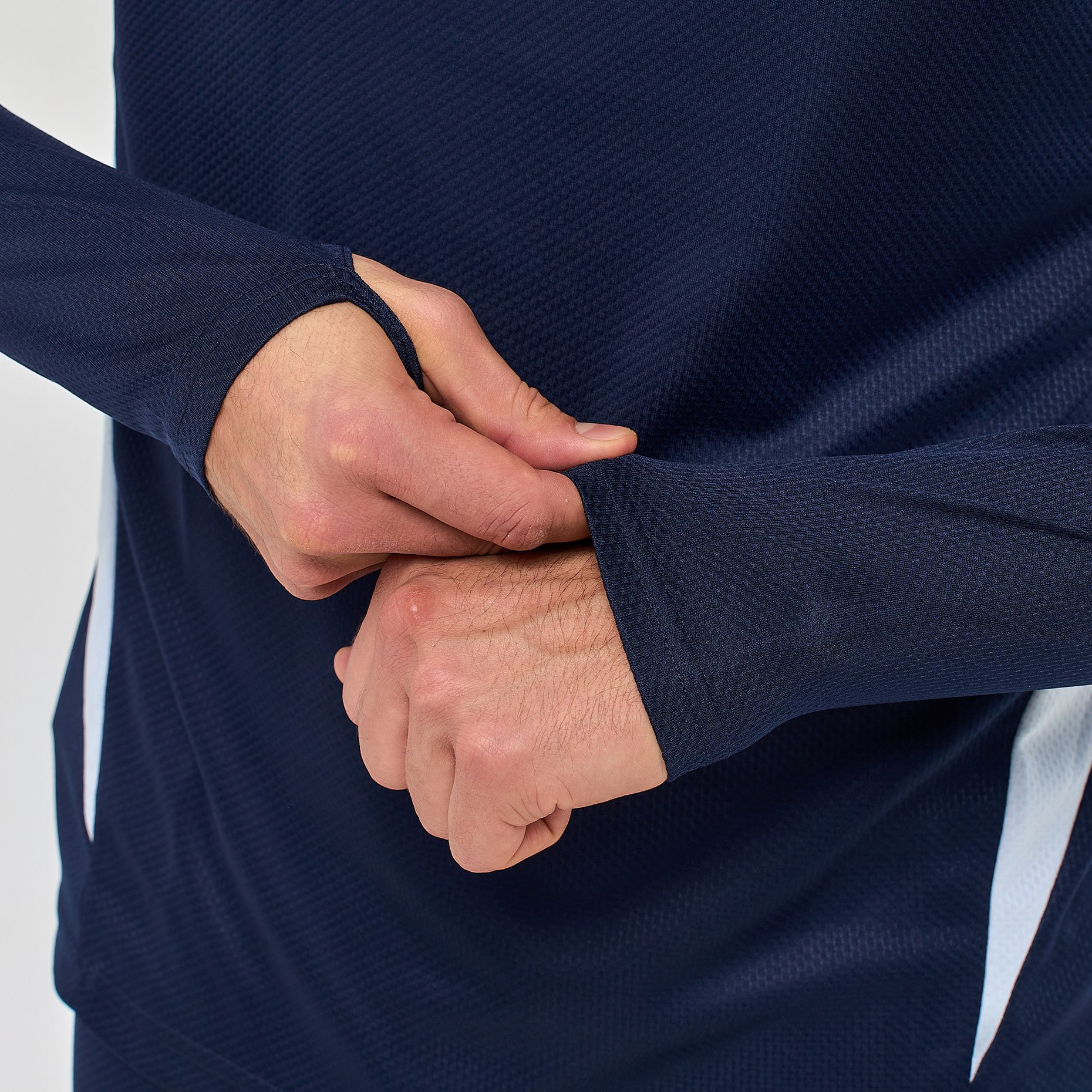 Практичные детали делают джемпер особенно удобным в использовании: короткая молния облегчает надевание и позволяет регулировать вентиляцию, а скрытые петли для больших пальцев на рукавах фиксируют их в нужном положении, исключая задирание при активных движениях. Модель подходит для занятий разными видами спорта — от футбола до фитнеса — и обеспечивает комфорт как в зале, так и на открытом воздухе.