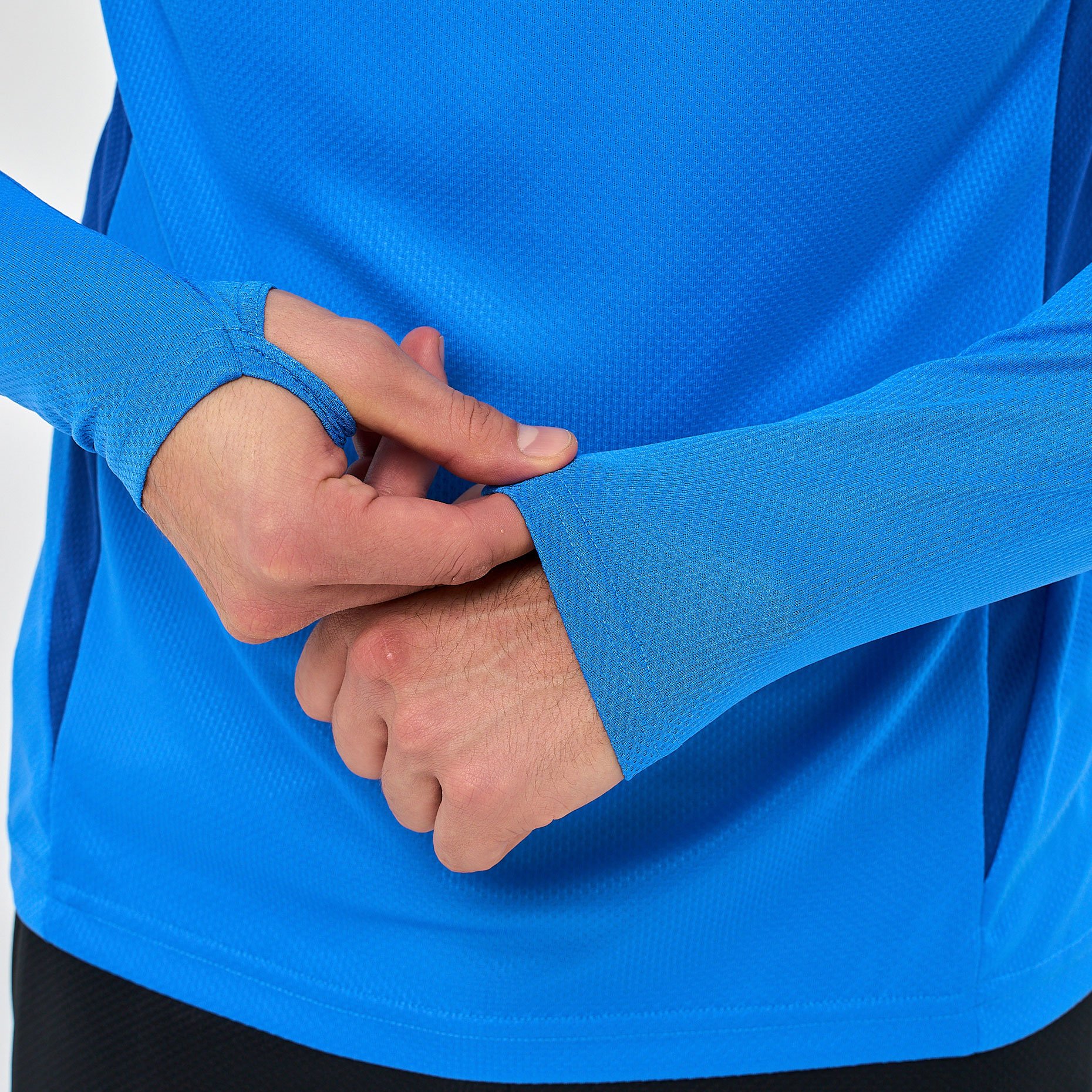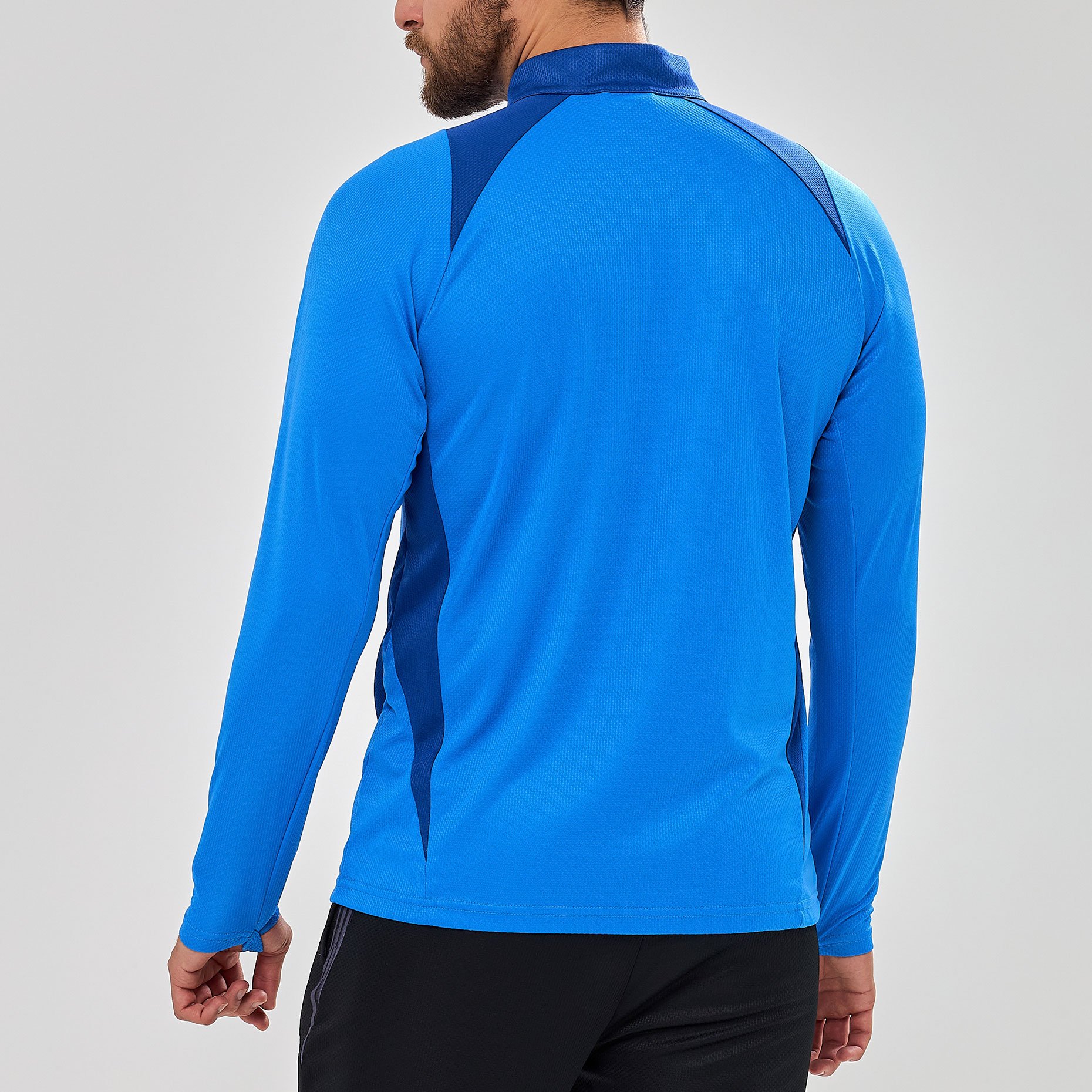 Практичные детали делают джемпер особенно удобным в использовании: короткая молния облегчает надевание и позволяет регулировать вентиляцию, а скрытые петли для больших пальцев на рукавах фиксируют их в нужном положении, исключая задирание при активных движениях. Модель подходит для занятий разными видами спорта — от футбола до фитнеса — и обеспечивает комфорт как в зале, так и на открытом воздухе.