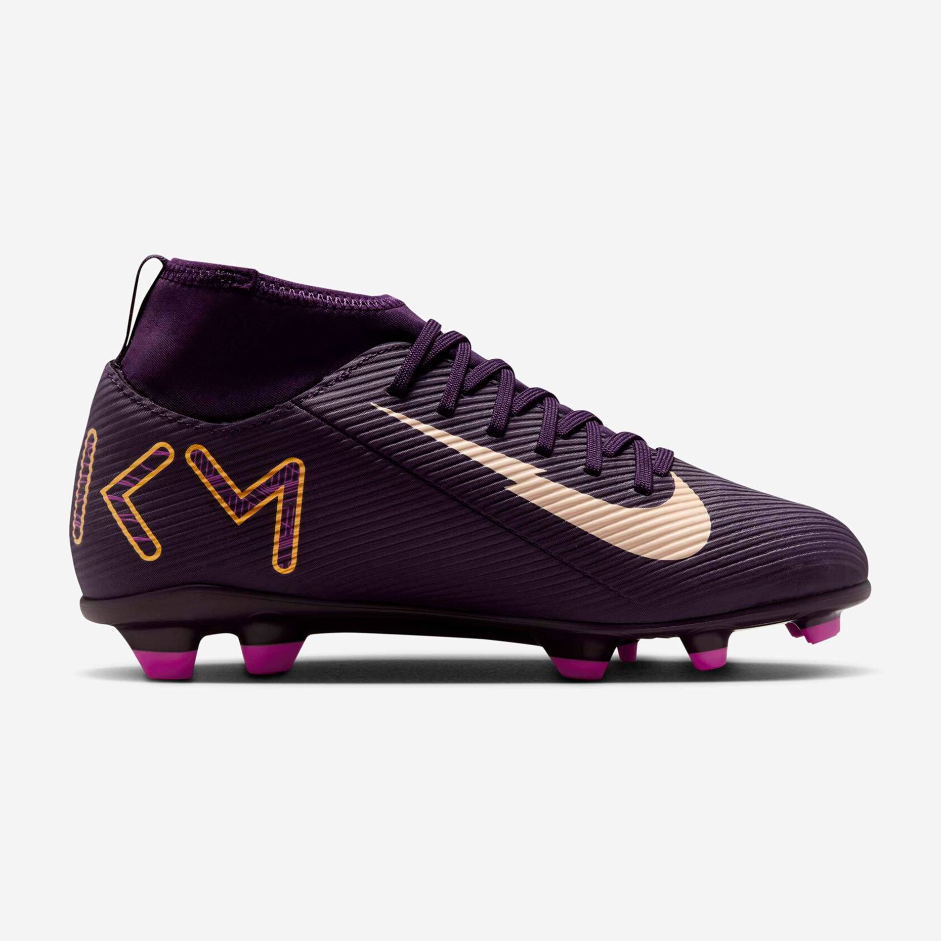 Детские бутсы Nike Mercurial Superfly 10 Club KM - это стильные детские бутсы сочетают в себе элементы различных эпох, воплощая дух знаменитого футболиста. Модель выполнена в эффектной цветовой гамме: фиолетовом цвете с элементами «слоновой кости» и золотой отделкой, украшенной символикой Rising Fire и отсылками к Bondy Dreams. Бутсы созданы специально для начинающих игроков и подходят для игры на жестких полях с натуральным или искусственным покрытием.