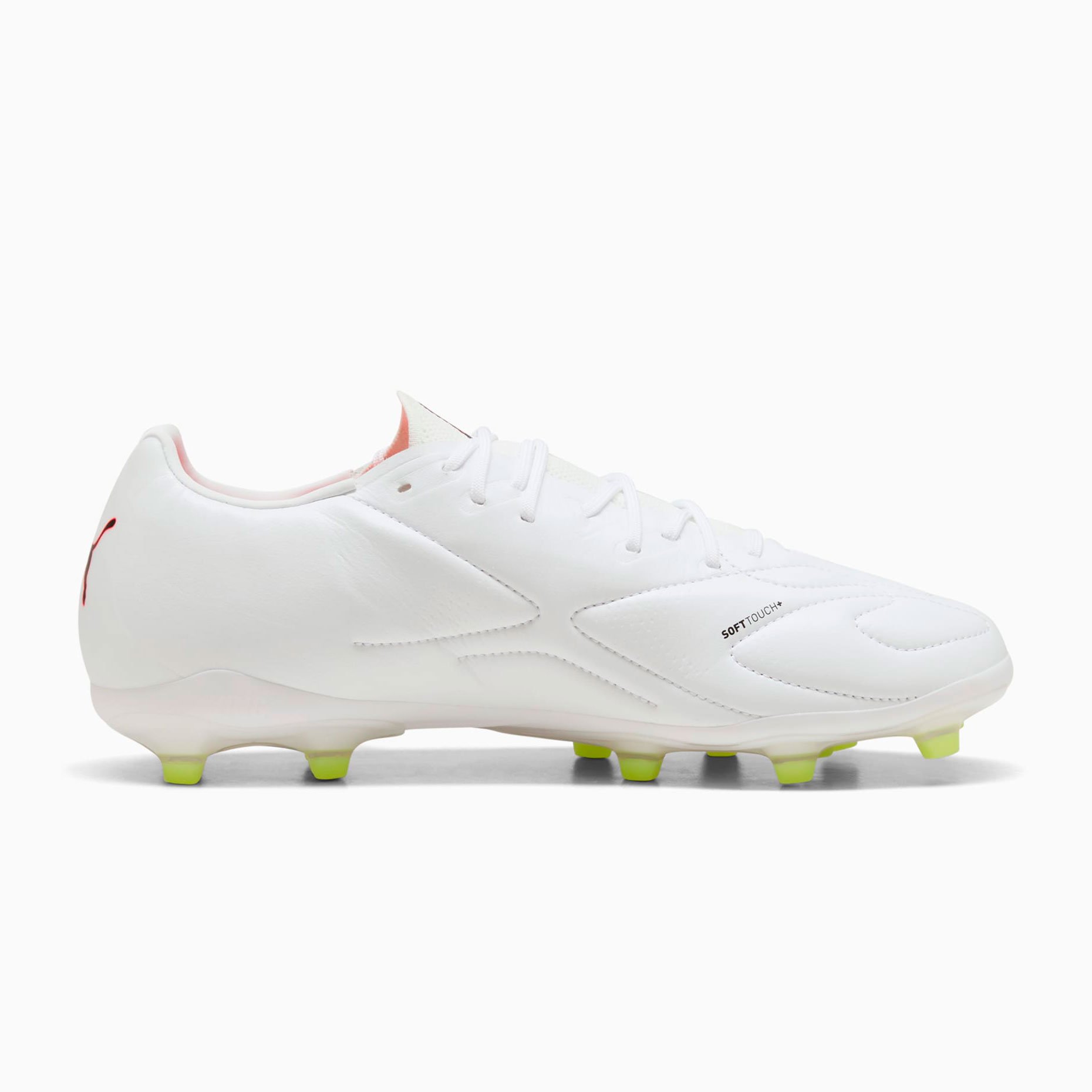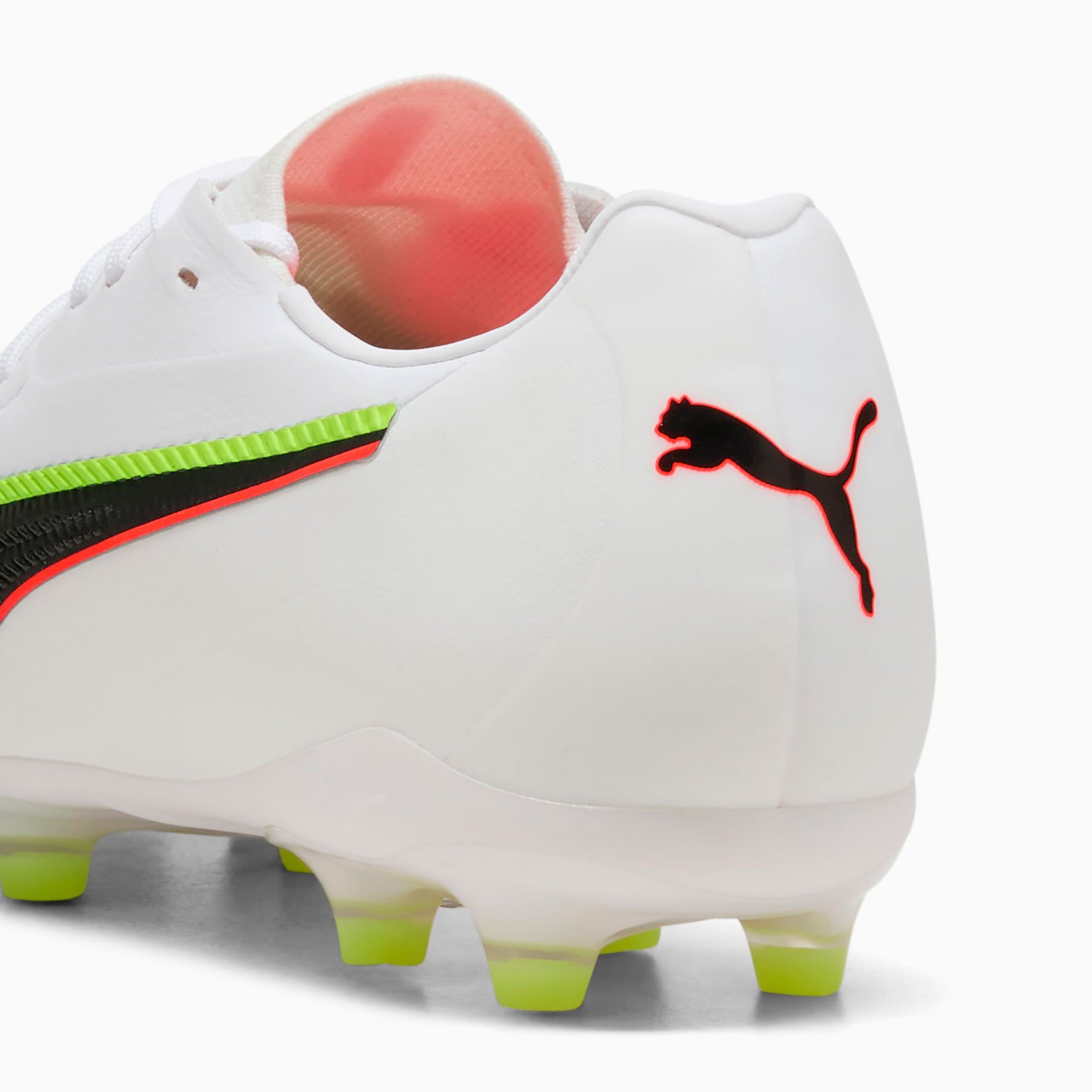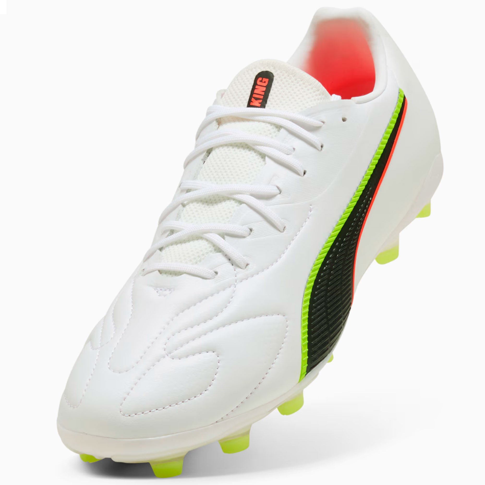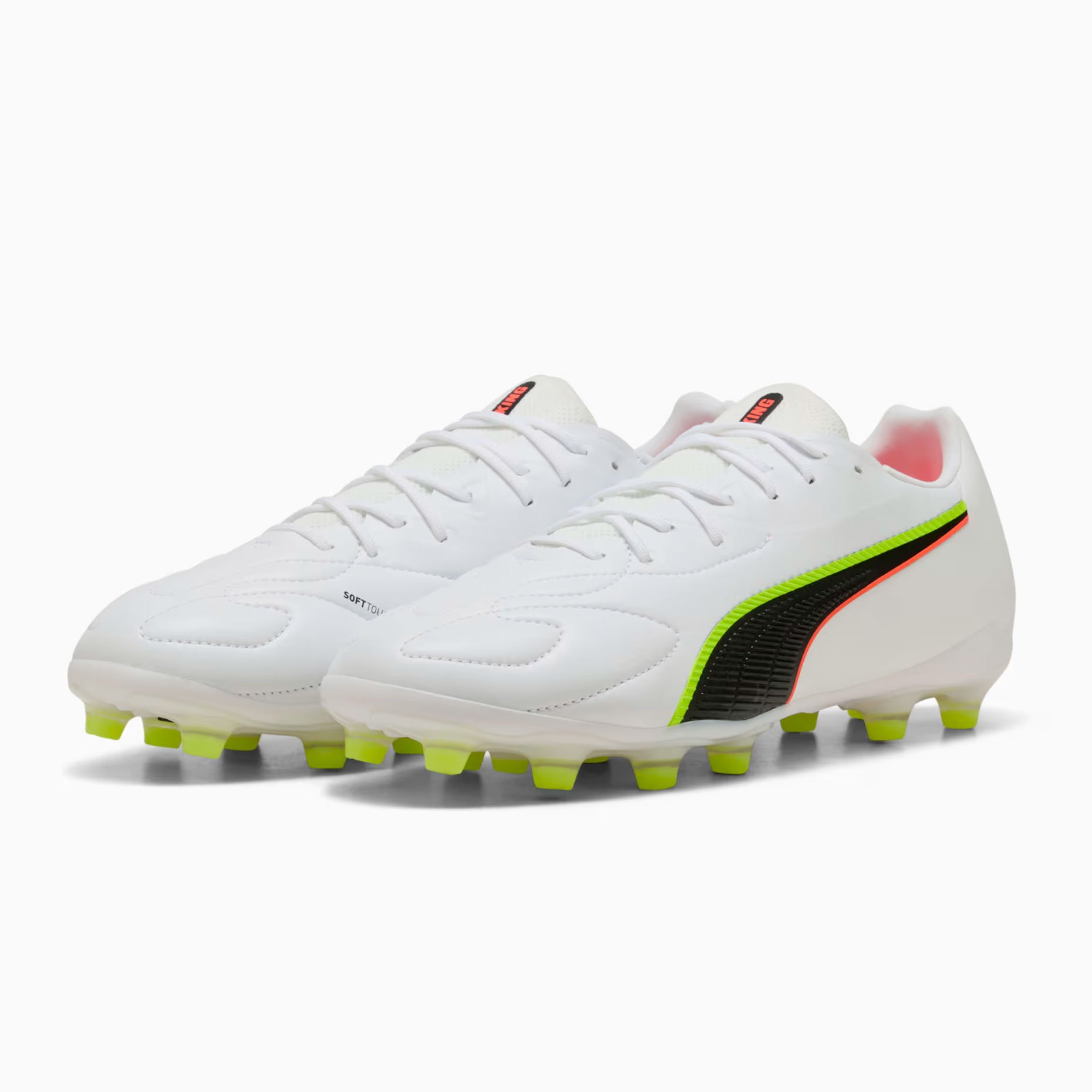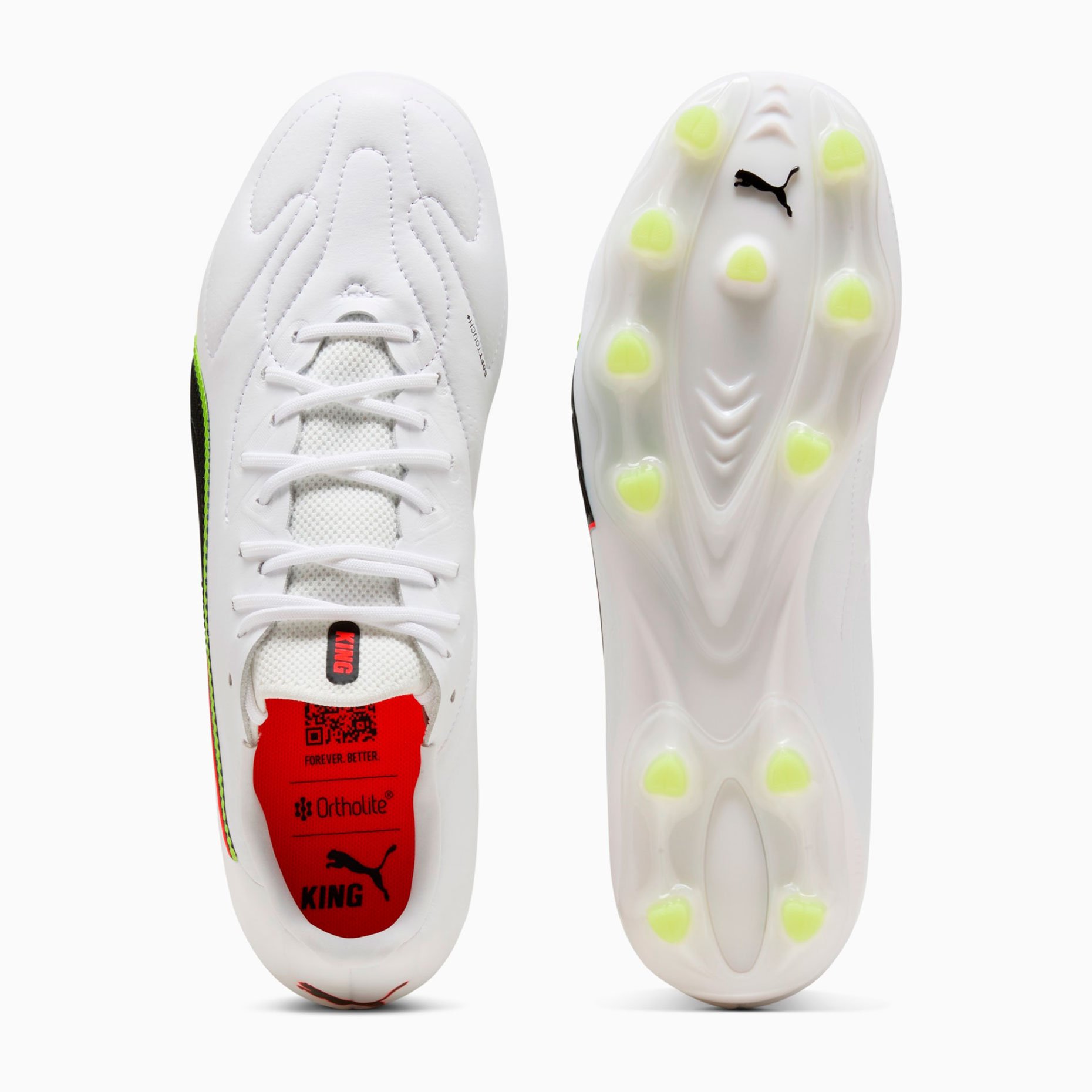 Лёгкая подошва FG/AG разработана специально для искусственной и натуральной травы, обеспечивая полный контроль над движениями так же, как и над мячом, с отличной манёвренностью и стабильностью. Зоны сцепления, вырезанные лазером, и 3D-текстура усиливают владение мячом при дриблинге, передачах и ударах, а мягкая пяточная подкладка со временем принимает индивидуальную форму стопы. Верхняя часть обуви изготовлена как минимум на 20% из переработанных материалов, сочетая легендарную классику Puma King с современным экологичным подходом.