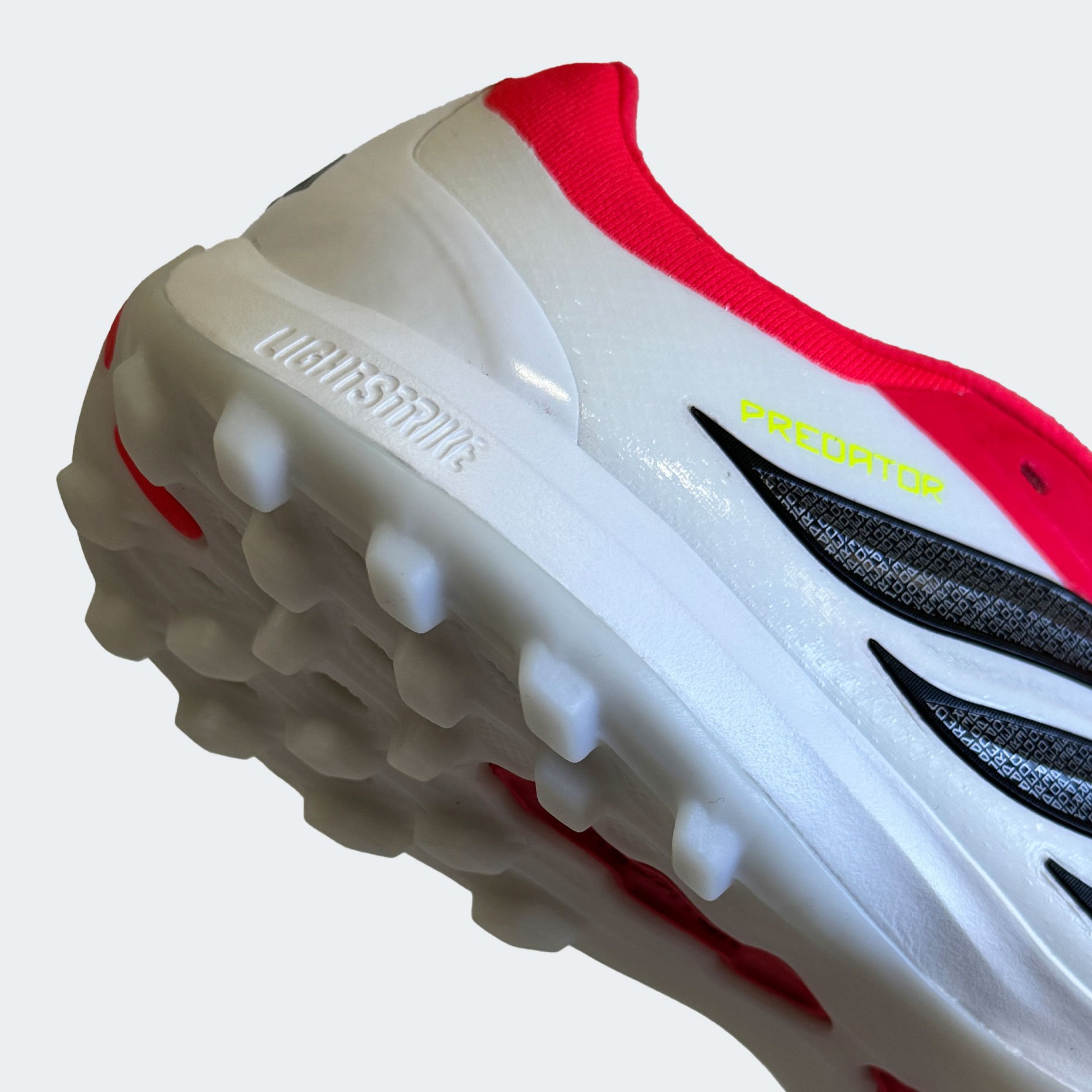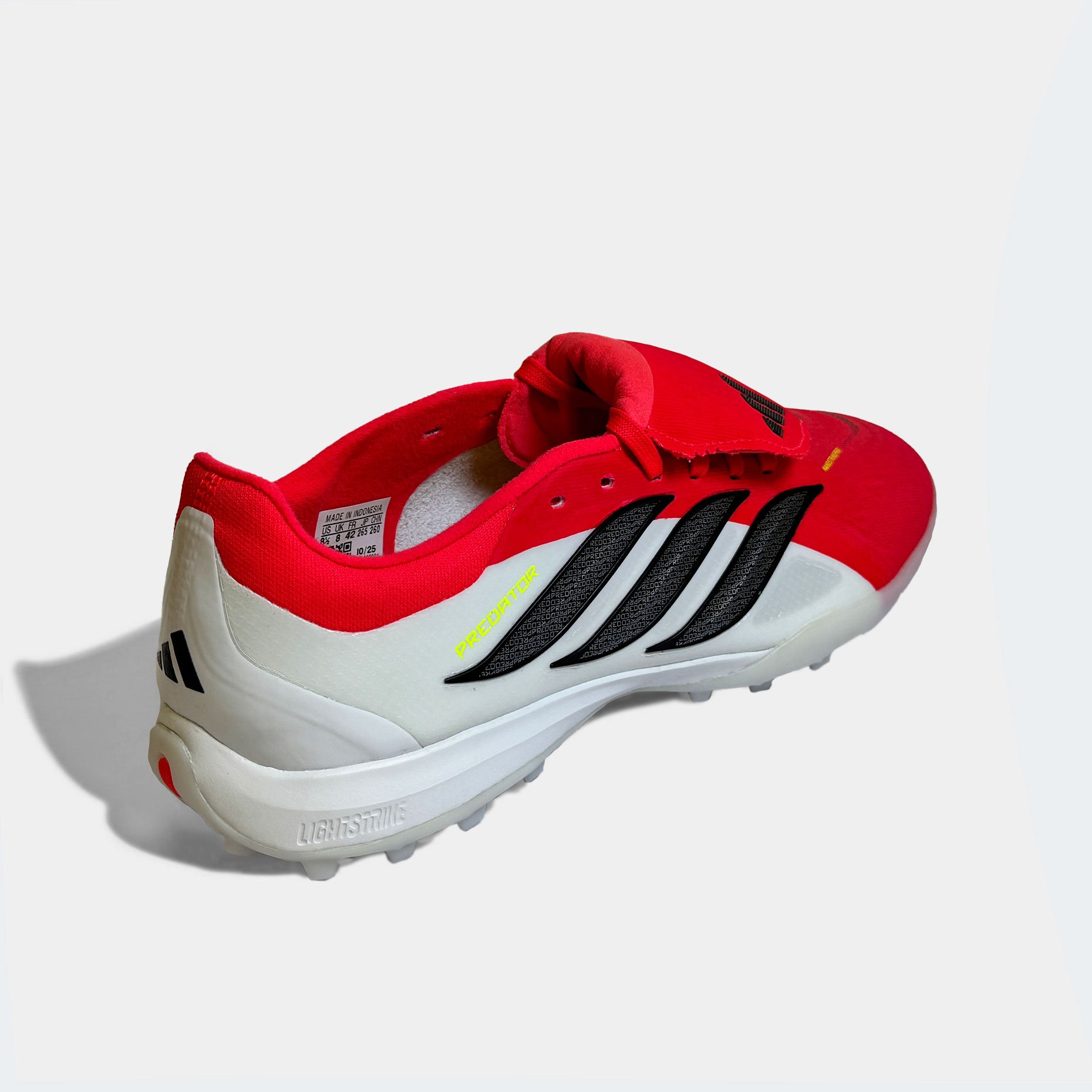 Откидной язычок с фиксатором на липучке обеспечивает надёжную и удобную посадку, легко регулируется и предотвращает смещение при активных движениях. Складчатая конструкция язычка формирует гладкую поверхность для удара, не отвлекая и не нарушая тактильных ощущений. Упругая межподошва LIGHTSTRIKE обеспечивает быстрый отклик и эффективную амортизацию, снижая усталость при длительных матчах. Съёмная анатомическая стелька с противоскользящим покрытием сверху дополнительно фиксирует стопу и повышает комфорт. Передняя часть бутс усилена износостойким покрытием, что продлевает срок службы при интенсивной эксплуатации. Волнистый дизайн «Трёх полос» в стиле Predator Precision, выполненный из переработанных материалов, подчёркивает премиальный характер модели и её связь с историей серии.