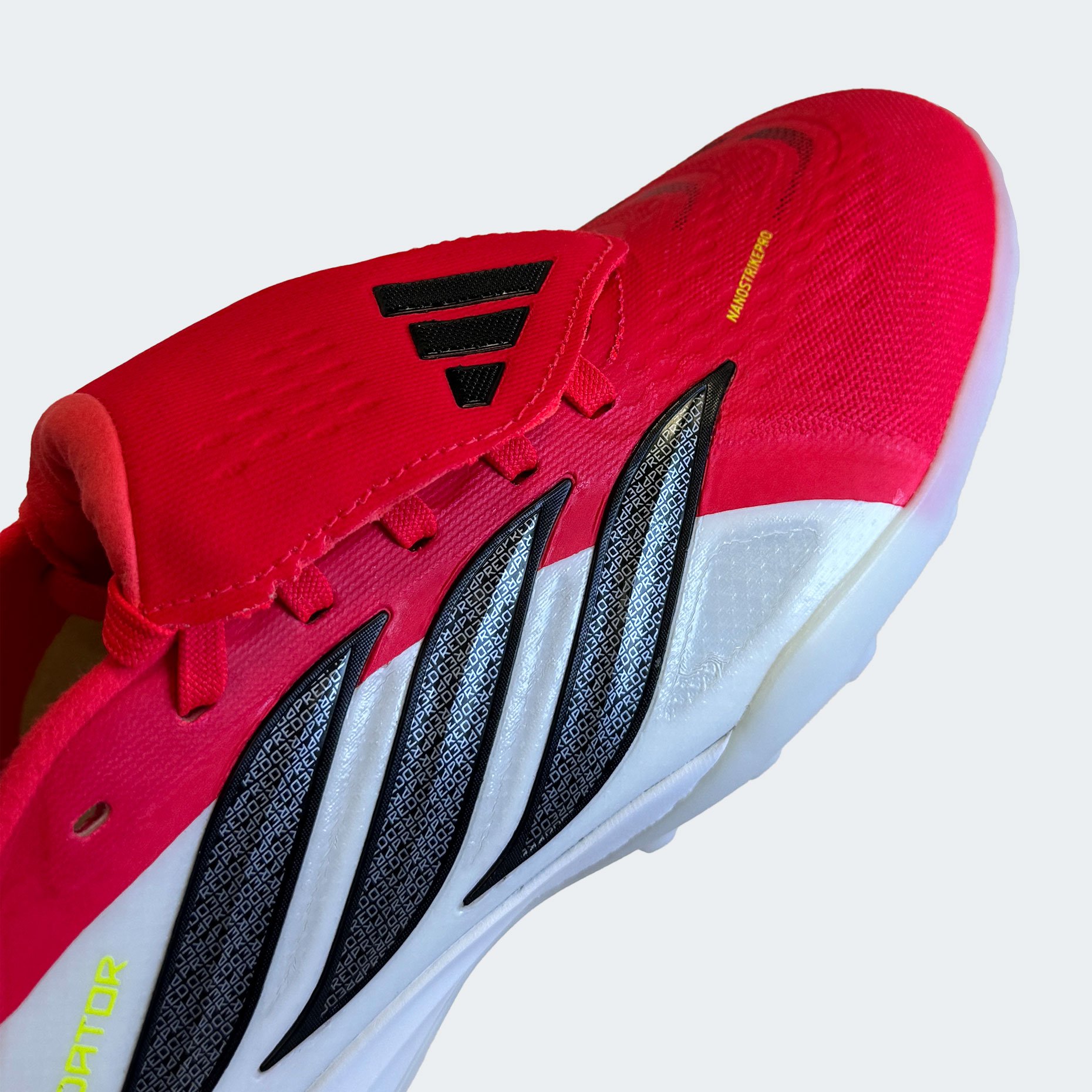 Шиповки adidas Predator Pro FT TF — это профессиональная модель, созданная для игроков высокого уровня, которым важны точность, мощь и полный контроль на полях с искусственным газоном. Эта версия продолжает эволюцию легендарной серии Predator, объединяя наследие бренда с передовыми технологиями нового поколения. Верх из инновационного материала NANOSTRIKEPRO обеспечивает исключительную мягкость, лёгкость и плотное прилегание к стопе, а интегрированные резиновые элементы на внутренней поверхности создают максимальное сцепление с мячом. Отказ от традиционных плавников StrikeSkin позволил получить более чистую и ровную зону контакта, что особенно важно при точных передачах, ударах и ведении в условиях высокой скорости игры.